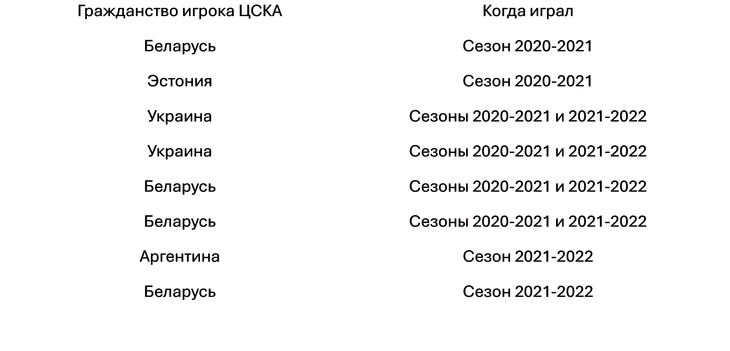 В 2021 за ЦСКА играло 8 иностранцев (мы обезличим их имена, но укажем гражданство и сезон, когда игрок играл, а все желающие вполне смогут их идентифицировать):