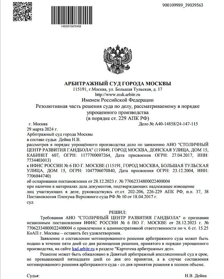 9 апреля 2024 Арбитражный суд города Москвы мотивированно объяснил, почему налоговый орган правомерно привлек к административной ответственности за нарушение валютного законодательства АНО «Столичный центр развития гандбола», более известный в гандбольных кругах как мужской гандбольный клуб «ЦСКА» (дело А40-14858/2024).