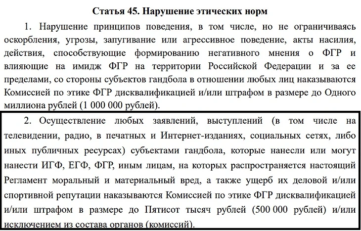 Эти же критерии субъектов гандбола перечислены и в ч. 2 ст. 1 Дисциплинарного регламента ФГР, поэтому мы можем сделать вывод, что раз комментаторы соответствуют этим критериям, то они – субъекты гандбола, и ФГР может применять к ним меры ответственности при наличии оснований.