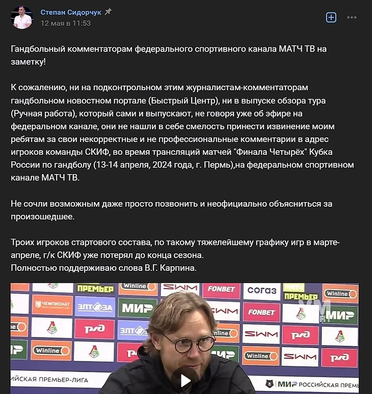 Мы прекрасно наслышаны о том, какой реально Степан Сидорчук прогрессивный и отличный тренер, которому действительно не все равно. И он делает совершенно правильную вещь, которую многие тренеры других команд не делают или не решились бы сделать – публично защищает своих игроков, а заодно поднимает очень актуальную проблему этичности публичных высказываний в нашем гандболе.