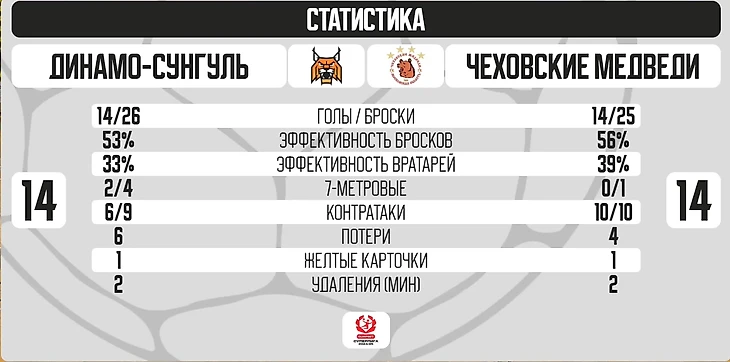 Быстрый центр Александра Аркатова не давал медведям вплотную приблизиться к сопернику. К 22-й минуте снежинцы вели +5, но чеховцы не собирались даже первый тайм проигрывать. Несколько неудачных атак «Сунгуля», сейвы Дмитрия Павленко и быстрые атаки гостей полностью нивелировали отставание. Первый тайм закончился со счетом 14:14. Дмитрий Павленко выиграл дуэль у Ивана Шарова по сейвам, чеховцы совершили чуть меньше потерь, чуть более эффективно атаковали. В целом статистика была почти равна, что и показывало табло.