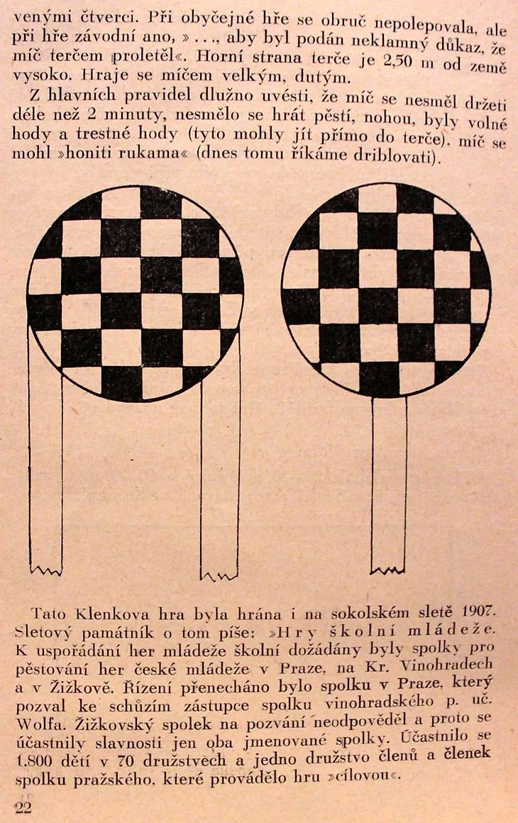Кленка показал игру перед публикой на V Всесокольском слете в Праге в 1907 году, где главные действующие лица были из кружка «господ и дам», который тогда был своего рода общественным и спортивным клубом в Праге.