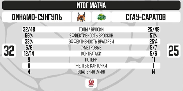 По прежнему не выходила у приезжей команды игра семь на шесть в нападении. А вот «Сунгуль» вдоволь веселился, доведя преимущество к половине второго тайма до плюс девяти. В последнюю треть времени на паркете появились резервисты – Павел Демаков, Никита Резник, Александр Савелов, Данил Мерц, Владимир Меркулов, что уже не могло поменять ничего. Давать шанс хозяева не стали и довели-таки матч до уверенной победы – 32:25, устроившись на шестой строчке рейтинга команд Суперлиги.