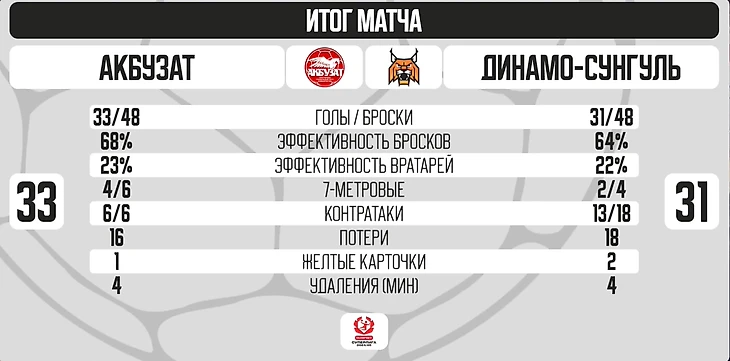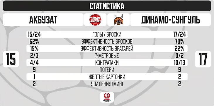 По точности бросков и отражениям вратарей «Сунгуль» был чуть сильнее, проигрывал в реализации семи метров. Показатель быстрых атак был лучше у южноуральцев в три раза. Потерь команды совершили одинаково по девять раз, удалялись по разу. Небольшое преимущество эффективности защиты и нападения, а также любимые быстрые атаки клуба из Челябинской области решили исход первой половины. Вот только теряли мяч очень много, в этом показателе стабильности очень не хватает.