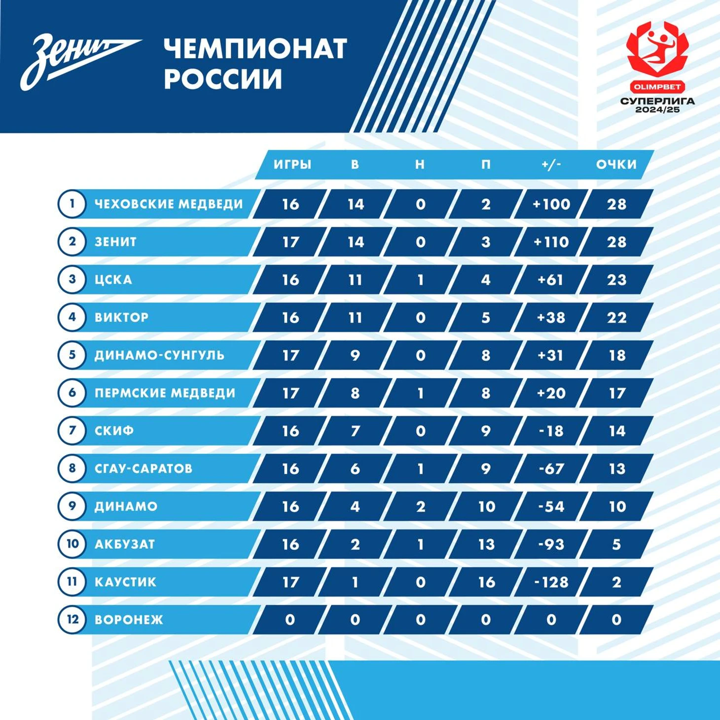 Так выглядела таблица предварительного этапа чемпионата России по гандболу перед дерби двух столиц «Зенит» – ЦСКА: