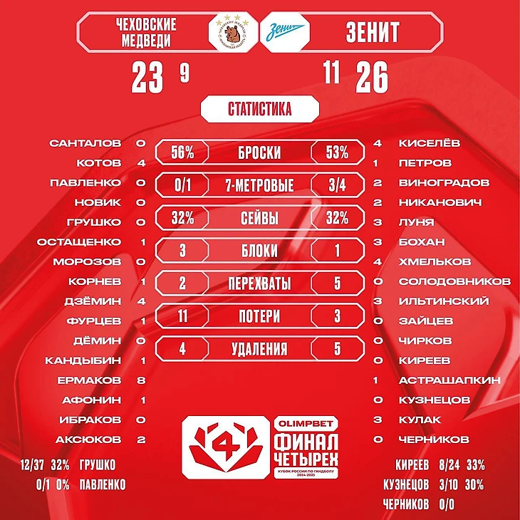 Во втором матче дня «Зенит» и «Чеховские медведи» выявили второго финалиста. В сезоне эти клубы встречались четыре раза, и 3 победы одержали гандболисты с берегов Невы.