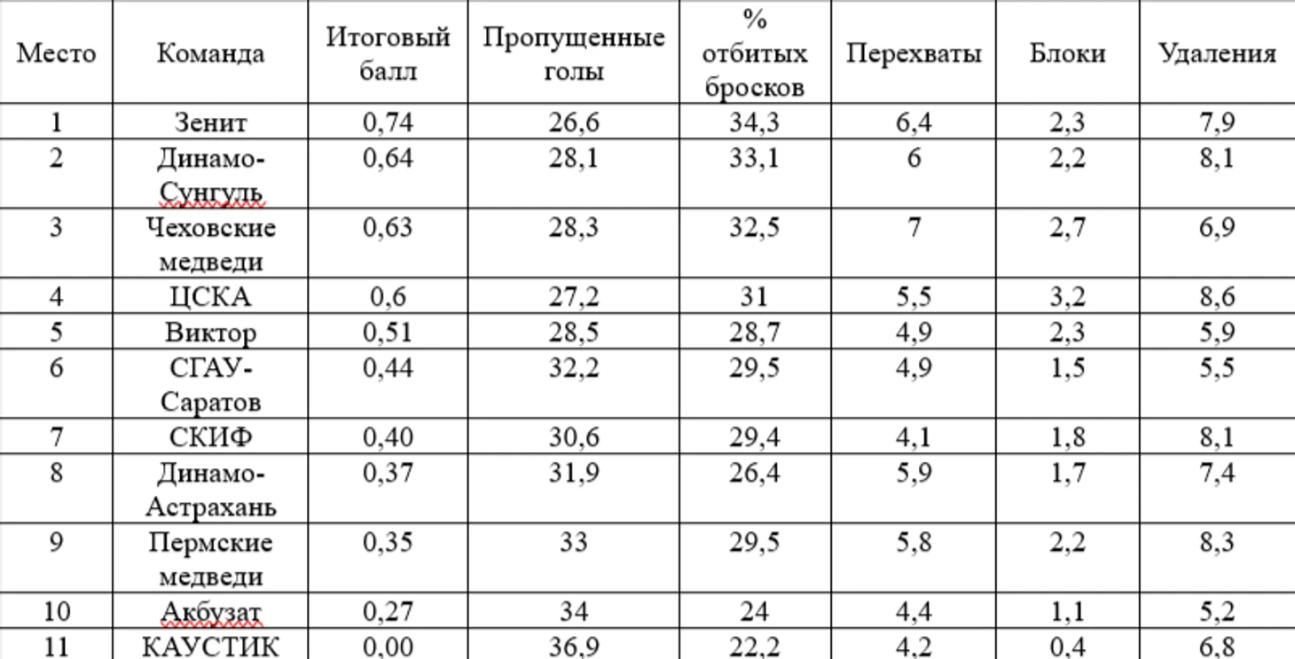 Исследование проведено на основе статистических данных, опубликованных на официальном сайте Федерации гандбола России. Анализу подверглись данные по 11 командам гандбольной «Суперлиги» за 16 матчей. Для оценки эффективности защиты использовалось 5 показателей, к каждому из них мы назначили свой вес, который определяется процентами. Сумма всех показателей должна быть равна 100%.