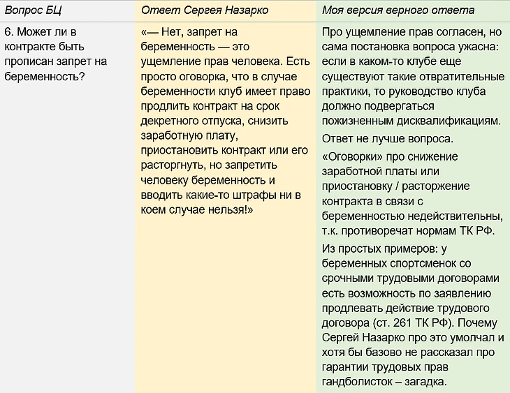 Честно, у меня нет четких ответов на эти вопросы сейчас. Но я точно знаю, что транслировать месседжи по типу «Штрафы в клубах для игроков, включение оговорки про расторжение договора с беременной гандболисткой – это нормальная практика» совершенно не нормально. И это проблема не только Сергея как интервьюируемого, но и прежде всего тех, кто так провел интервью и опубликовал это в таком виде.