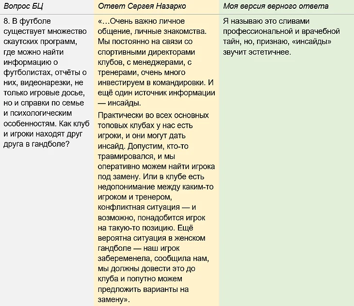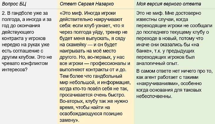 И, да, я не утверждаю, что спортивные агенты – серые кардиналы гандбола. Я исхожу из того, что аккредитованные агенты ФГР – профессионалы, которые не позволяют себе подобных историй (хотя по некоторым ответам Сергея Назарко есть большие вопросы, об этом далее), тем более что волею судьбы с одним из агентов довелось познакомиться лично и я бесконечно уважаю этого человека.