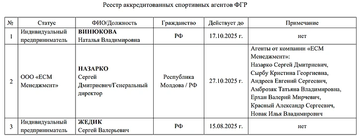 Последний реестр спортивных агентов ФГР публиковало осенью 2024, сейчас он выглядит так: