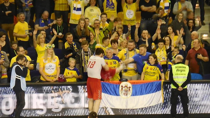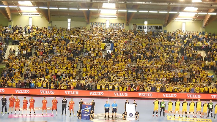За час до игры польские фанаты уже вывесили свои баннеры. Самый яркий и заметный из них – «Iskra Kielce». Нынешнее название клуба «Виве Таурон» является спонсорским. «Таурон» связан с польским спортом не только через клуб из Кельце – ледовый дворец в Кракове тоже носит спонсорское название «Таурон-Арена».