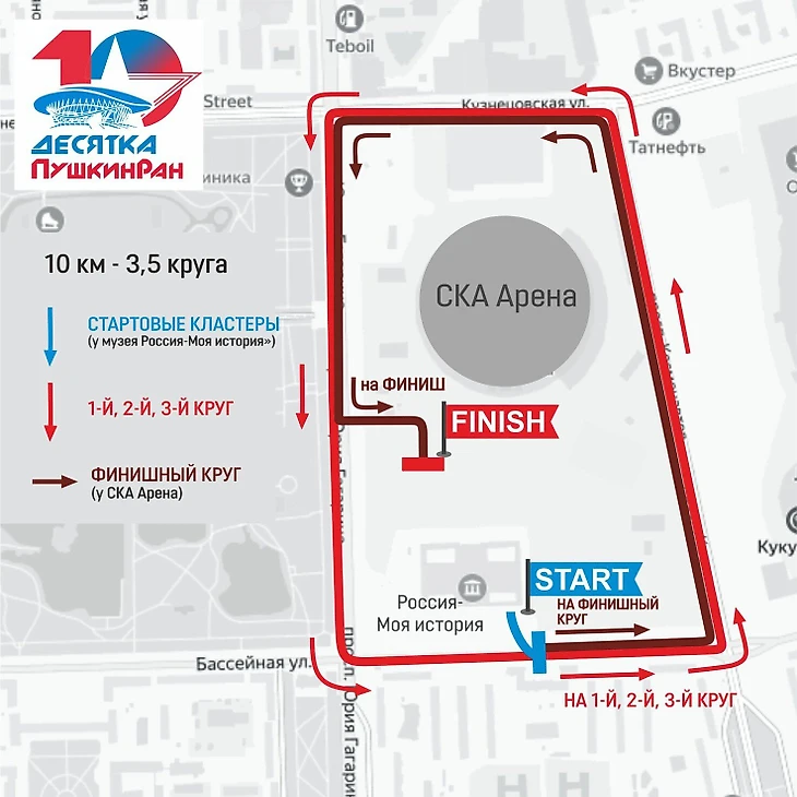 Участники соревновались только на дистанции 10 км, без забегов-спутников. Трасса забега – плоская, без перепадов высот – проходила рядом с новым стадионом «СКА-Арена» и музеем «Исторический парк «Россия – моя история»». Выдача стартовых пакетов была организована прямо в музее.