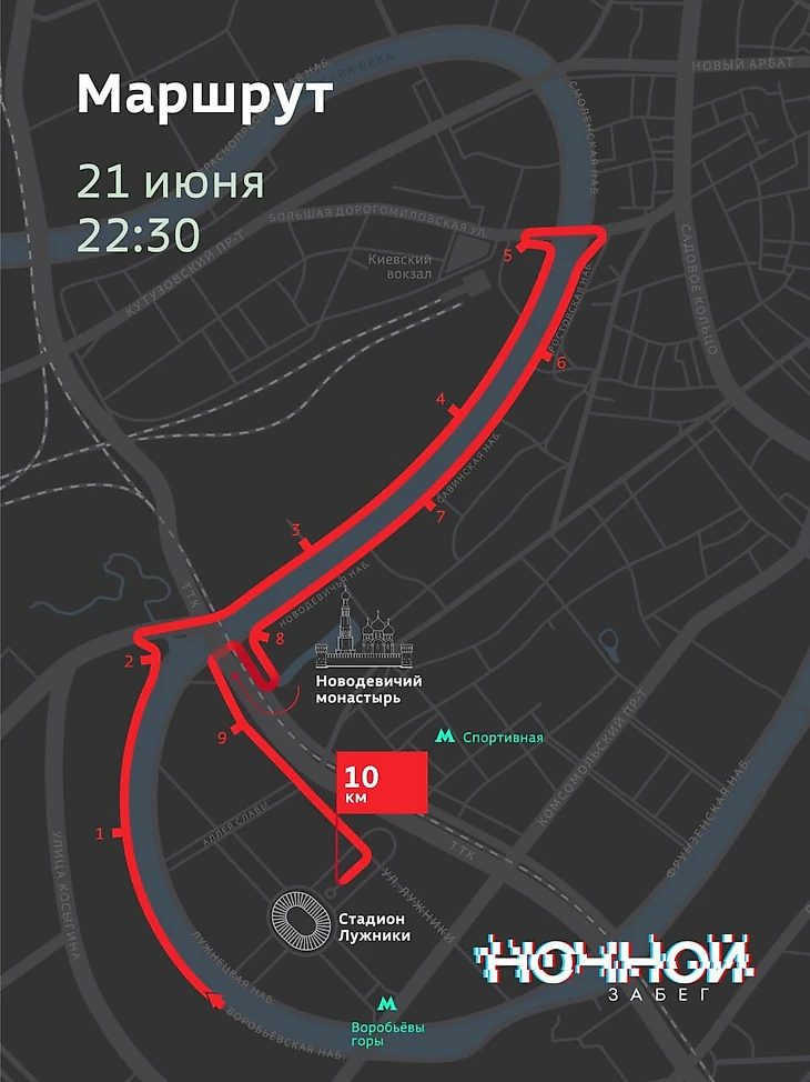 Открылась регистрация на «Ночной забег» – старт на дистанции 10 км от московских организаторов «Беговое сообщество». Он пройдет в субботу 21 июня. В 22:30 бегуны будут стартовать с набережной Косыгина на Воробьевых горах. Трасса линейная, финиш забега располагается в точке, отличной от места старта – у арены «Лужники».