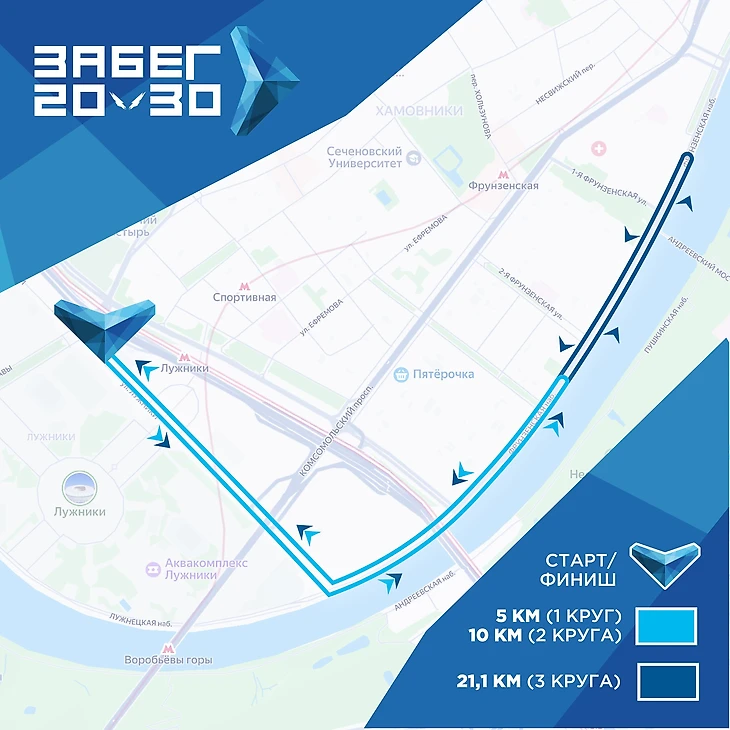 Забег на полумарафонской дистанции стартует в 7:15, на дистанции 5 км – в 19:30, на дистанции 10 км – в 20:45. Стартово-финишный городок будет располагаться на территории СК «Лужники». Маршрут дистанций пройдет по Фрунзенской набережной и по улице Лужники.