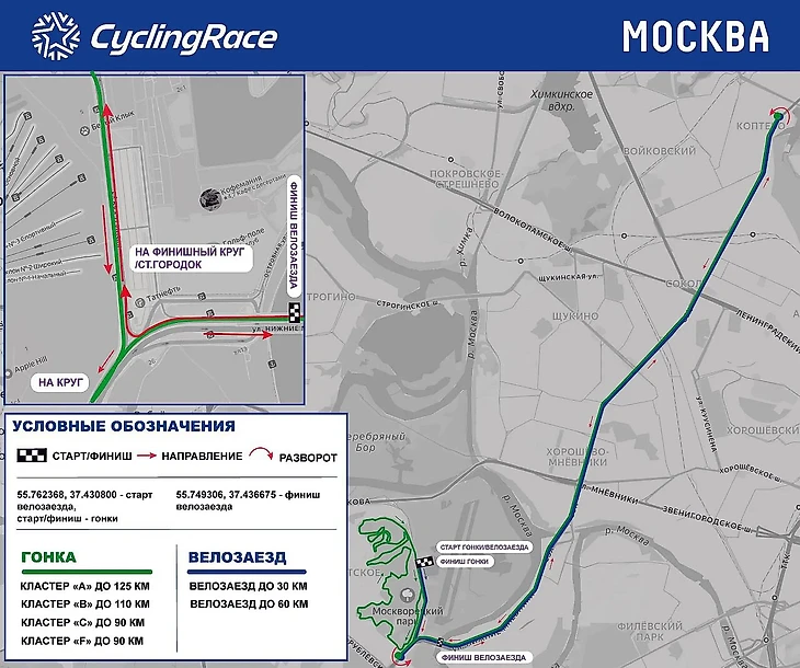 Участники гонки на 120 км проедут несколько кругов по открытому после реконструкции Олимпийскому велокольцу в Крылатском. Остальная часть трассы проходит по улице Нижние Мнёвики, улице Народного Ополчения и Алабяно-Балтийскому тоннелю.