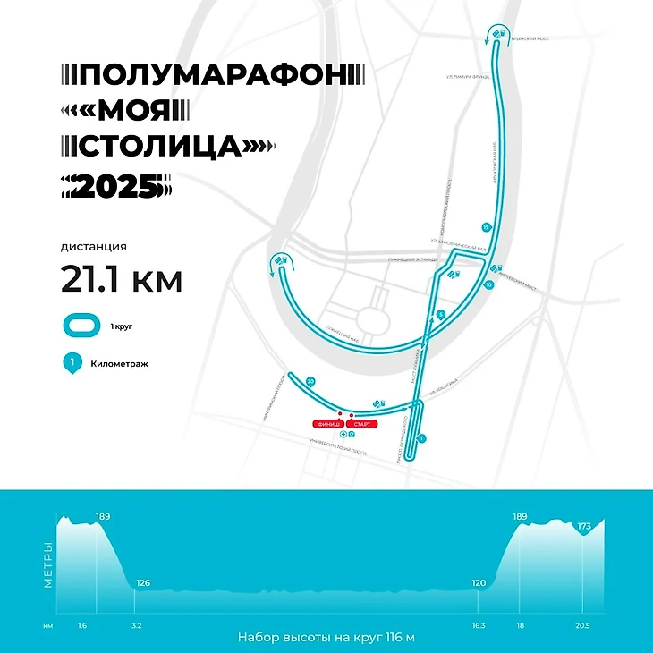 Набор высоты на полумарафоне составит 116 м, на дистанции 10 км – 76 м, на дистанции 5 км – 41 м.