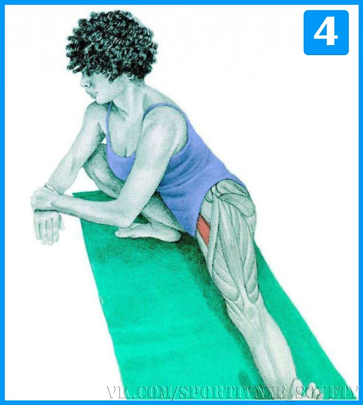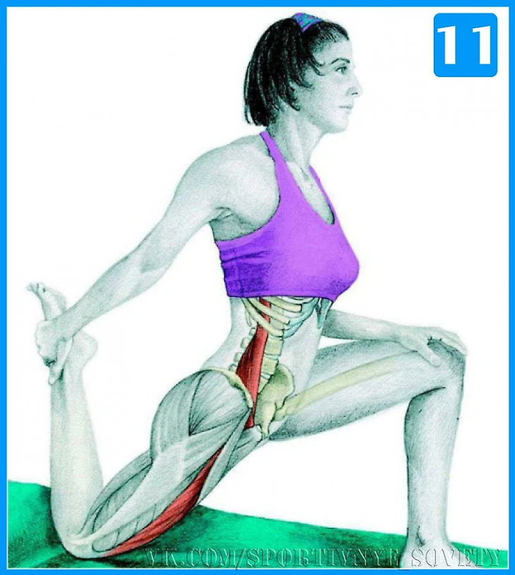 Техника выполнения: встань на колено, медленно подай правое бедро вперед. Возьмись за стопу сзади и напрягите ягодичную мышцу.