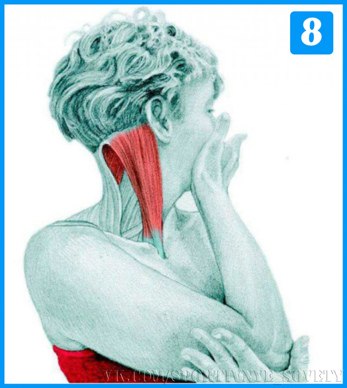 Задействованные мышцы: грудино-ключично-сосцевидная и верхняя трапециевидная.