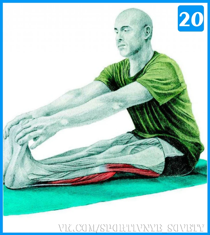 Техника выполнения: в положении сидя, колени согнуты, спина ровная. Начни медленно выпрямлять ноги, чуть прогибая спину, постарайся коснуться стоп.
