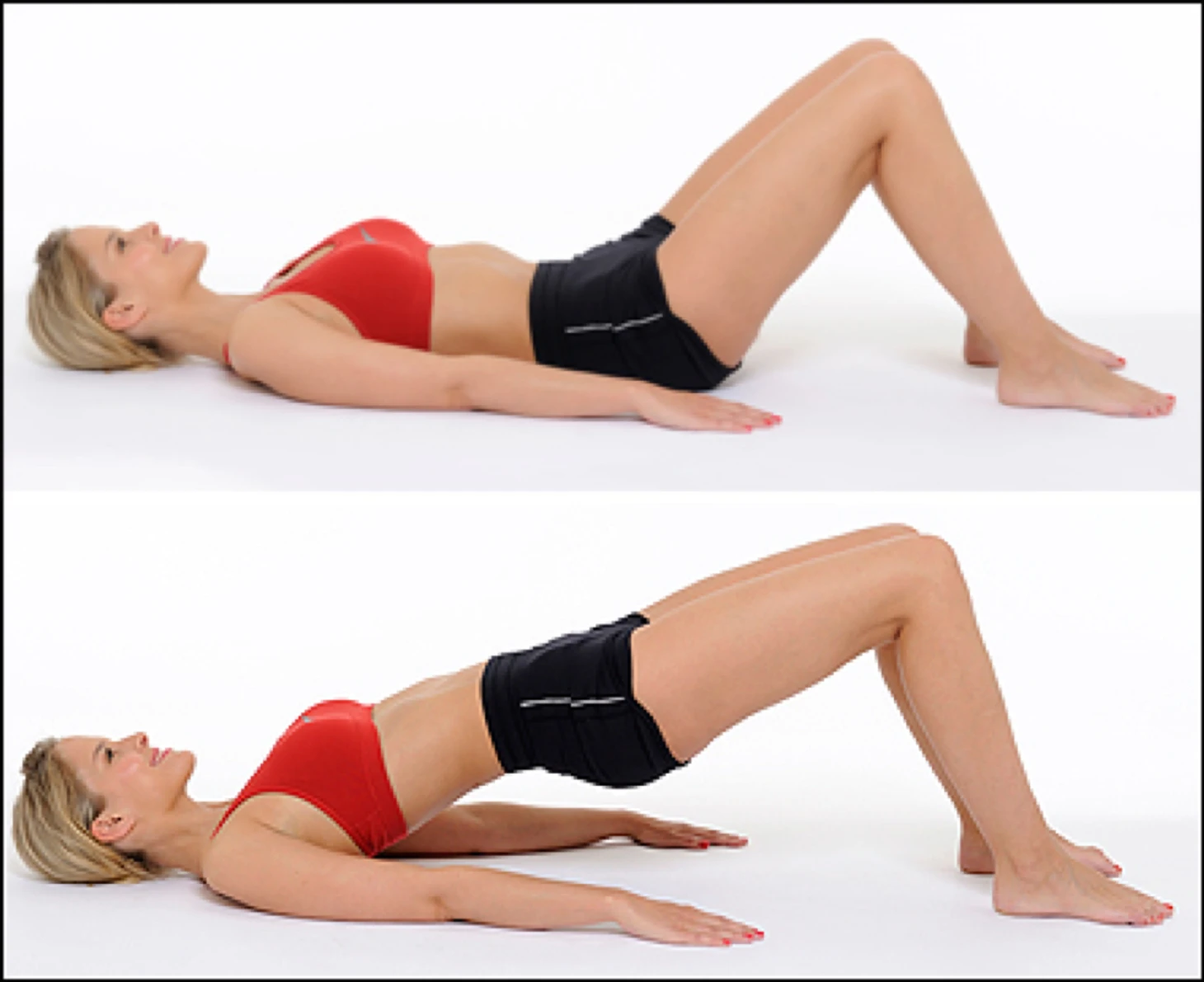Данное упражнение отлично укрепляет мышцы нижней части спины. Лягте на пол, согните колени под прямым углом. Поднимите таз вверх, зафиксируйте это положение на 3-5 секунд и вернитесь в исходное.
