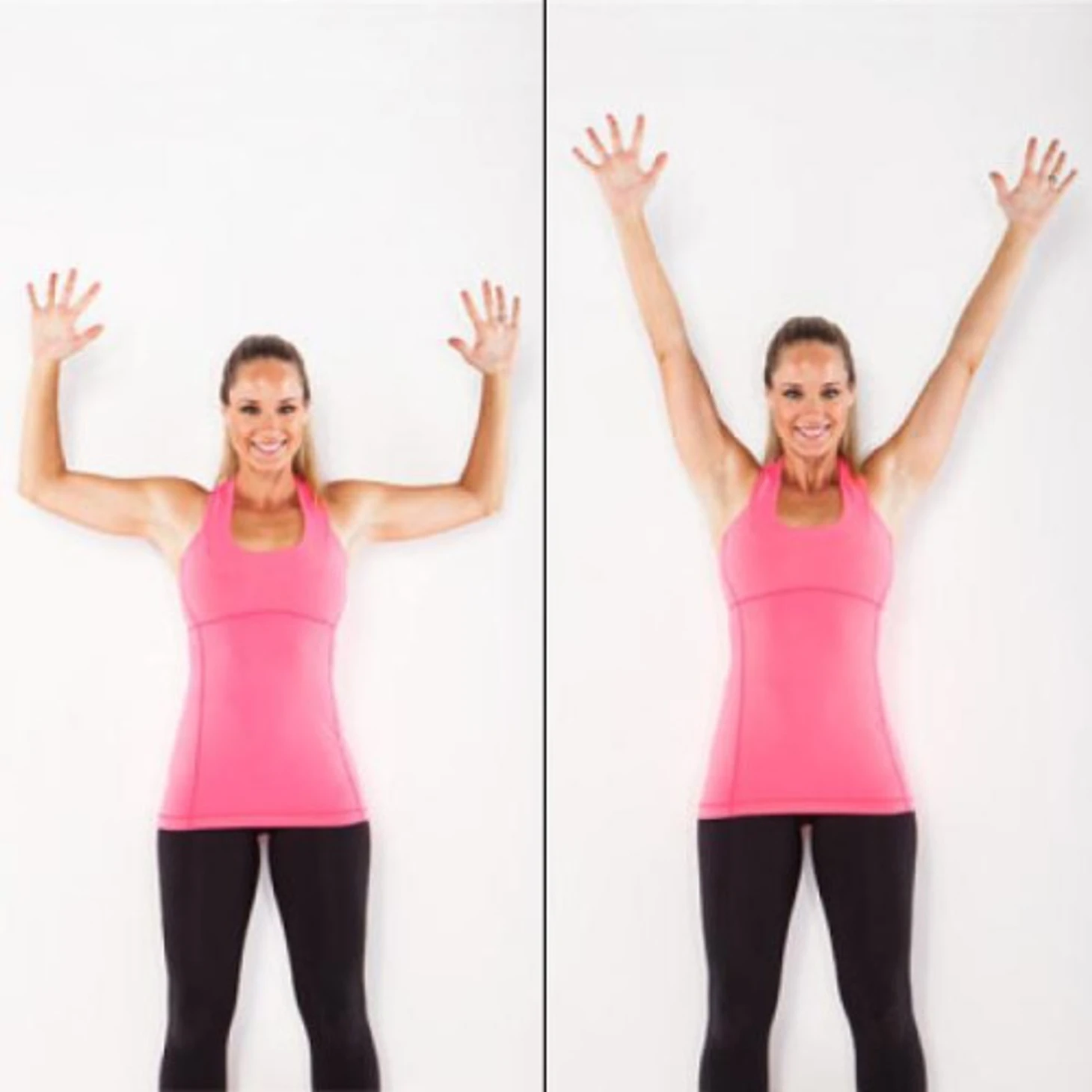 Данное упражнение хорошо укрепляет мышцы верхней части спины. Подойдите к стене и вплотную прижмитесь к ней спиной. Ступни должны находиться в 30-35 сантиметрах от стены. Затем поднимите руки вверх, плотно прижмите тыльную сторону рук к стене на уровне головы – это исходное положение. Далее, не отрывая прижатых рук, двигайте ими вверх, стараясь держать локти прижатыми к стене. Сомкните поднятые руки вверх над головой и вернитесь в исходное положение. Рекомендуется 3 подхода по 15 раз.