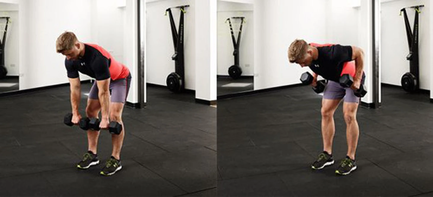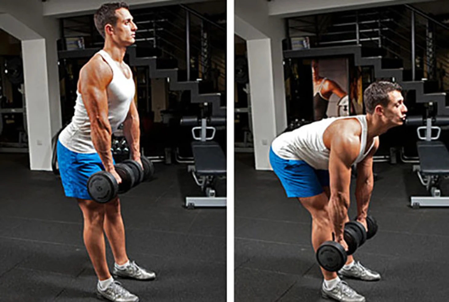 Наклоните корпус чуть вперед, взяв при этом в руки две одинаковые гантели.