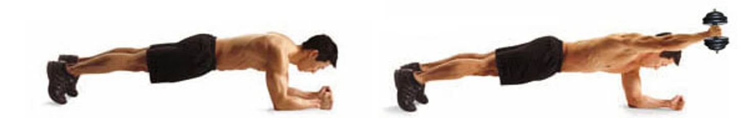 Обычная статическая планка прекрасно укрепляет все мышцы спины, что благотворно влияет на позвоночник. В данном варианте мы рассмотрим немного другой вид упражнения – динамическую планку с гантелями.