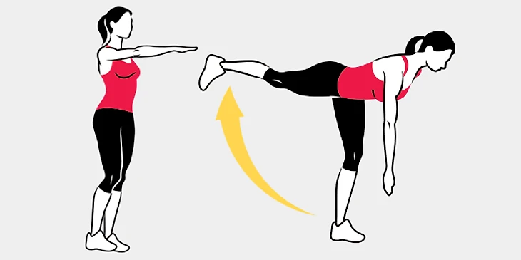 Встаньте прямо, левая рука опущена вдоль туловища, правая – вытянута вперед. Сделайте наклон корпуса, одновременно отводя правую ногу назад, пока бедра не образуют угол в 90°. Тянитесь правой рукой к полу, почувствуйте натяжение в бедре и подколенном сухожилии. Сделайте 10 раз на каждую ногу.