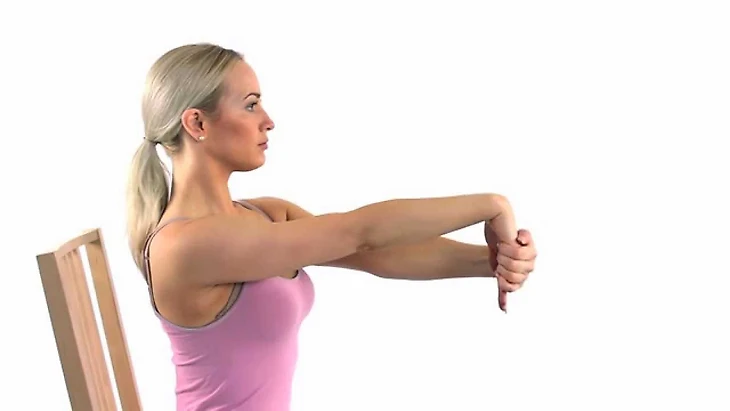 Вытяните выпрямленную правую руку вперед, согните запястье, ладонь повернута к себе. Возьмитесь левой рукой за пальцы рук правой и слегка потяните к себе. Затем разверните ладонь от себя и снова потяните за пальцы к себе. Поменяйте руки местами. Повторите по 10 раз на каждую руку.