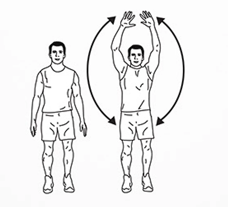 Встаньте прямо, ноги на ширине плеч, руки опущены. Начинайте одновременно поднимать руки через бока, пока не коснетесь ладонями над головой. Медленно опустите вниз. Повторите 10 раз.