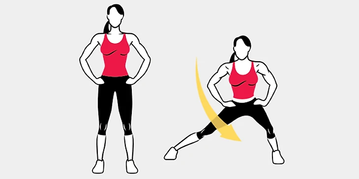 Встаньте прямо, руки на поясе, ноги шире плеч. Начинайте делать поочередные выпады вправо-влево. Приседание выполняется пока в опорной ноге не будет угол в 90°, вторая нога одновременно с этим должна выпрямиться. Сделайте по 10 выпадов в каждую сторону.