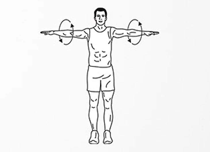 Встаньте прямо, ноги на ширине плеч. Прямые руки вытянуты в стороны. Начинайте вращать руки в локтевых суставах. Сначала по часовой стрелке, затем против часовой. Повторите 10 раз.