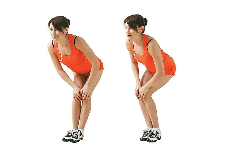 Встаньте прямо, ноги вместе. Немного наклонитесь вперед, положите руки на колени и начинайте делать вращение по часовой стрелке. Посчитайте до десяти, затем сделайте вращение против часовой стрелки.