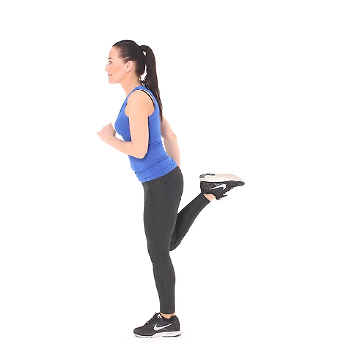 Встаньте прямо. Согните правую ногу в колене, отведите назад и схватите правой рукой за лодыжку. Слегка потяните вверх, пока не почувствуете натяжение в передней поверхности бедра. Поменяйте ноги. Повторите 10 раз.