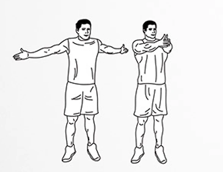 Встаньте прямо, ноги на ширине плеч, руки вытянуты перед собой. Начинайте разводить прямые руки в стороны. Почувствуйте натяжение в плечах, грудных мышцах, мышцах спины. Вернитесь в исходное положение. Повторите 10 раз.