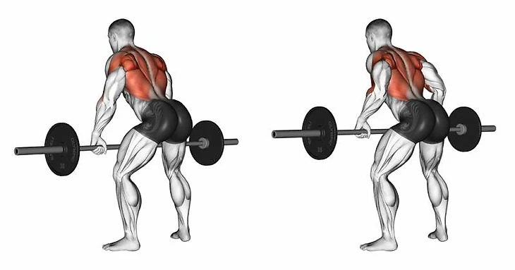 Возьмите штангу в руки, хват чуть шире плеч. Наклонитесь немного вперед на чуть согнутых ногах. Спина должна быть прямой. Начинайте тянуть штангу к себе, пока гриф не коснется брюшного пресса. Плавно опустите вниз.