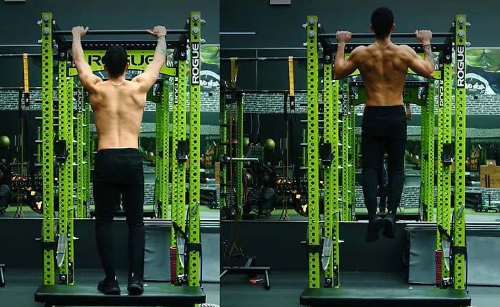 Теперь встаньте на скамью и возьмитесь за перекладину хватом чуть шире плеч. Начинайте подтягиваться вверх, используя силу мышц. Медленно возвращайтесь, пока не разогнете руки. Затем снова встаньте ногами на скамью и подтягивайтесь.