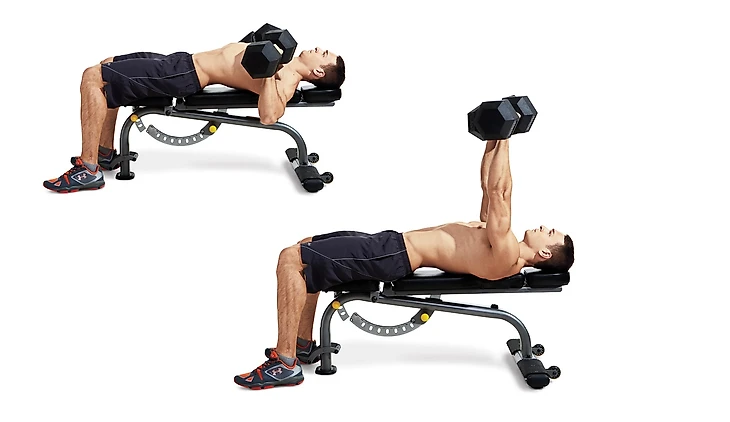 Возьмите по гантели в каждую руку и лягте на скамью. Ноги расставьте чуть шире плеч и плотно прижмите пятки к полу. Напрягите мышцы пресса и спины. Выжмите гантели от груди вверх, пока руки не станут прямыми. Медленно верните их в исходное положение.