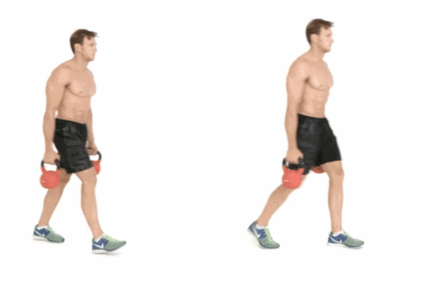 Возьмите для начала пару гантелей или гирь суммарным весом в 25–30% от массы тела и сделайте 20–40 шагов. Если легко, можете добавить веса или усложнить упражнение и ходить выпадами.