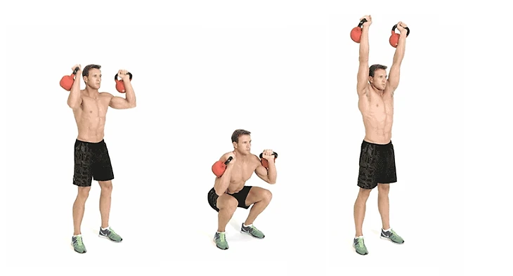 Встаньте прямо, ноги чуть шире плеч. Возьмите в каждую руку по гантеле или гире. Согните руки в локтях, снаряды должны оказаться над плечами. Сделайте приседание, пока бедра не станут параллельны полу. При вставании в исходное положение в верхней точке выжмите гантели/гири над головой. Верните руки в исходное положение.