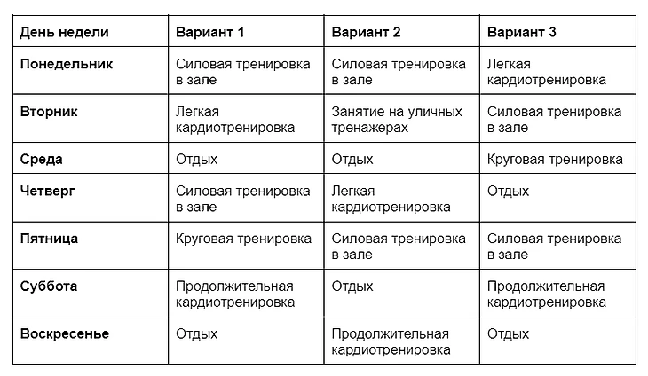 Возьмем среднестатистического человека, работающего по стандартному графику 5/2 и имеющего возможность тренироваться только после работы в будние дни, а также на выходных.
