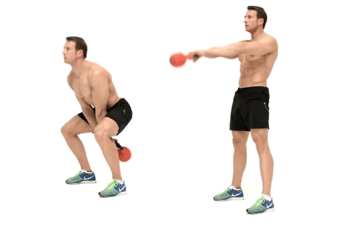 Встаньте прямо, ноги чуть шире плеч и слегка согнуты в коленях. Гирю удерживайте обеими руками между ног. Немного отклонитесь назад, одновременно выпрямите ноги и сделайте вынос гири вперед на прямых руках. Обратное движение гиря совершит сама. Ваша задача чуть согнуть колени и позволить ей идти как маятнику назад. Каждое маховое движение задается от ног к рукам.