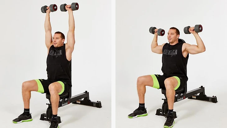 Сядьте на стул, возьмите гантели в руки и поднимите немного выше плеч, удерживая ладони в положении от себя. Далее поднимайте гантели вверх и плавно опускайте обратно.