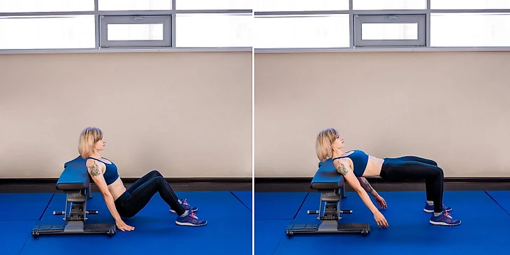 Еще одно движение для проработки ягодичной зоны. Сядьте на пол, плечами обопритесь о подходящую опору (например, диван). Удерживая колени согнутыми, поднимите таз и опустите обратно. Следите, чтобы в верхней позиции тело было параллельно полу.