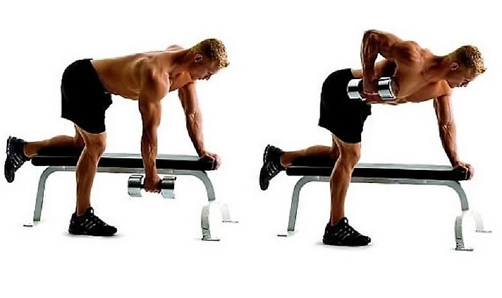 Для выполнения этого упражнения потребуется тренировочная скамья или пара устойчивых стульев. Удерживая гантелю в левой руке, поставьте на опору правое колено и вытянутую правую руку. Теперь аккуратно опускайте гантель вниз и подтягивайте ее обратно вверх, активно задействуя лопатки. Поменяйте руки и ноги местами и сделайте для другой стороны.