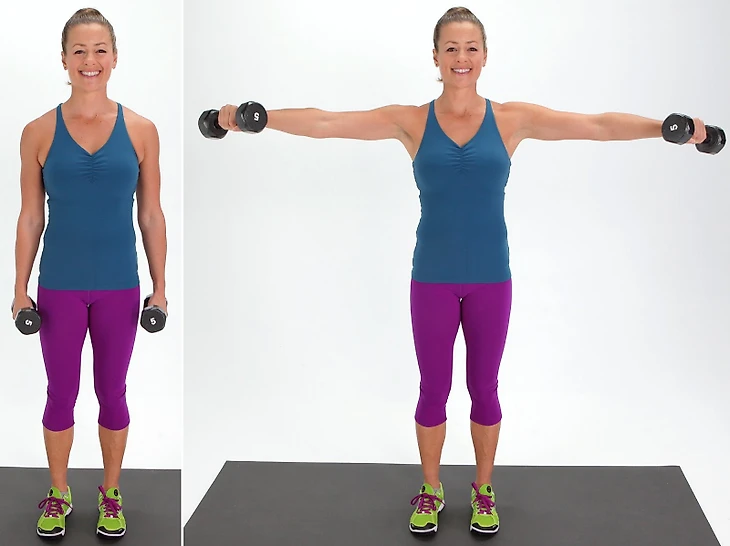 Встаньте прямо, возьмите гантели и разведите руки в стороны, пока они не станут параллельны полу. Локтевые суставы слегка согнуты, плечи при выполнении движений подниматься не должны. Корпус удерживайте прямо, махи делайте спокойно, избегая резких движений.