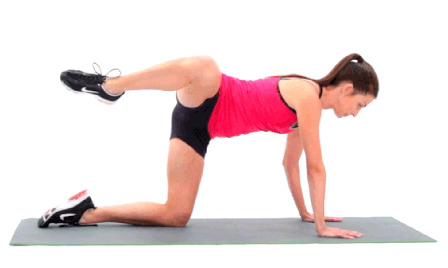 Исходное положение аналогичное предыдущим вариантам — на четвереньках. Поднимаем ноги поочередно, отводим назад, при этом угол в колене должен быть 90 градусов. Стопа относительно голени должна находиться под прямым углом. Фиксируем положение, затем максимально быстро стараемся поднять ногу пульсирующими движениями как можно выше от пола.