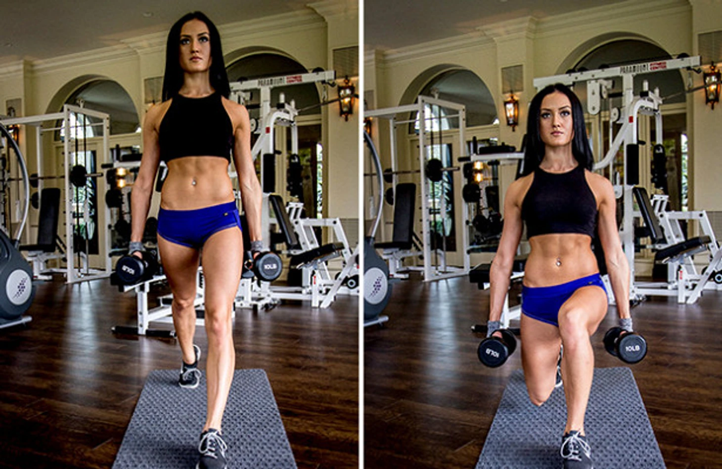 1. Корпус прямой в любой точке выпада. В руки берем утяжелители, они помогут удерживать корпус в прямом положении и дадут нагрузку одновременно на верхнюю часть тела.