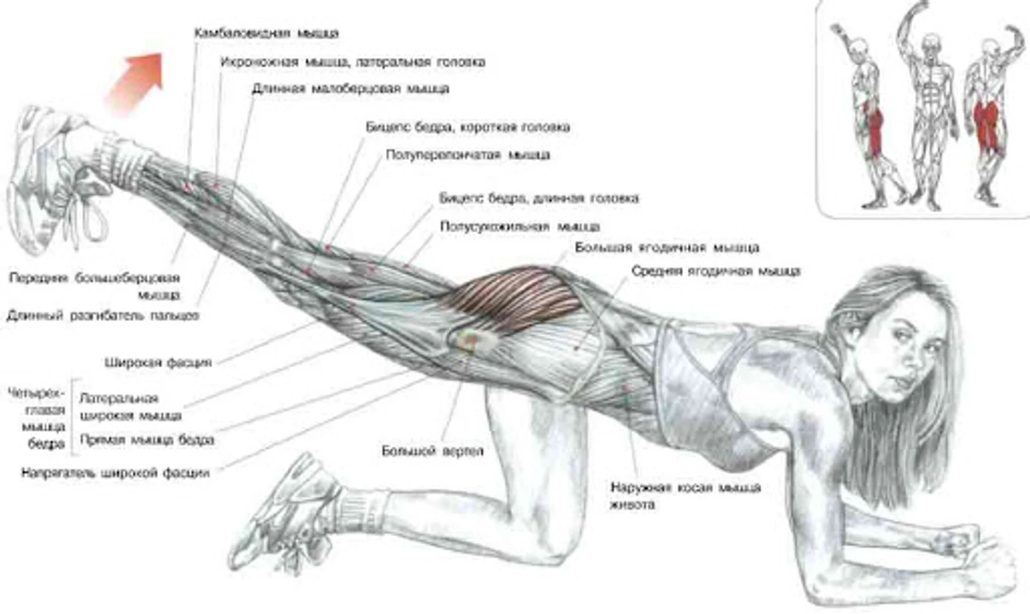 Средняя и малая ягодичные мышцы расположены под большой. Многие новички считают, что внутреннее расположение никак не влияет на форму и упругость этой части тела. Это в корне неверно, потому что именно средняя и малая ягодичные мышцы в большей степени отвечают за подтянутость и упругость ягодиц.