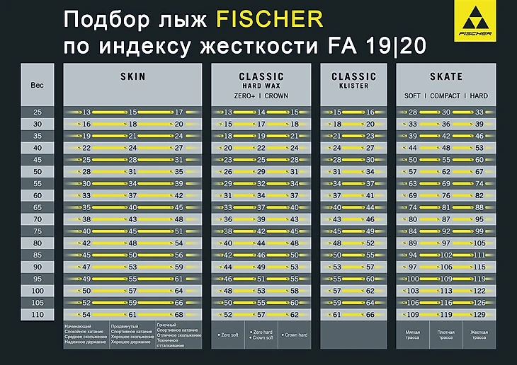 Наглядно о том, как выбрать лыжи по росту, указано в таблице ниже. Большое значение имеет и вес человека. Здесь пропорция прямая – чем больше вы весите, тем выше должен быть показатель жёсткости у лыж.
